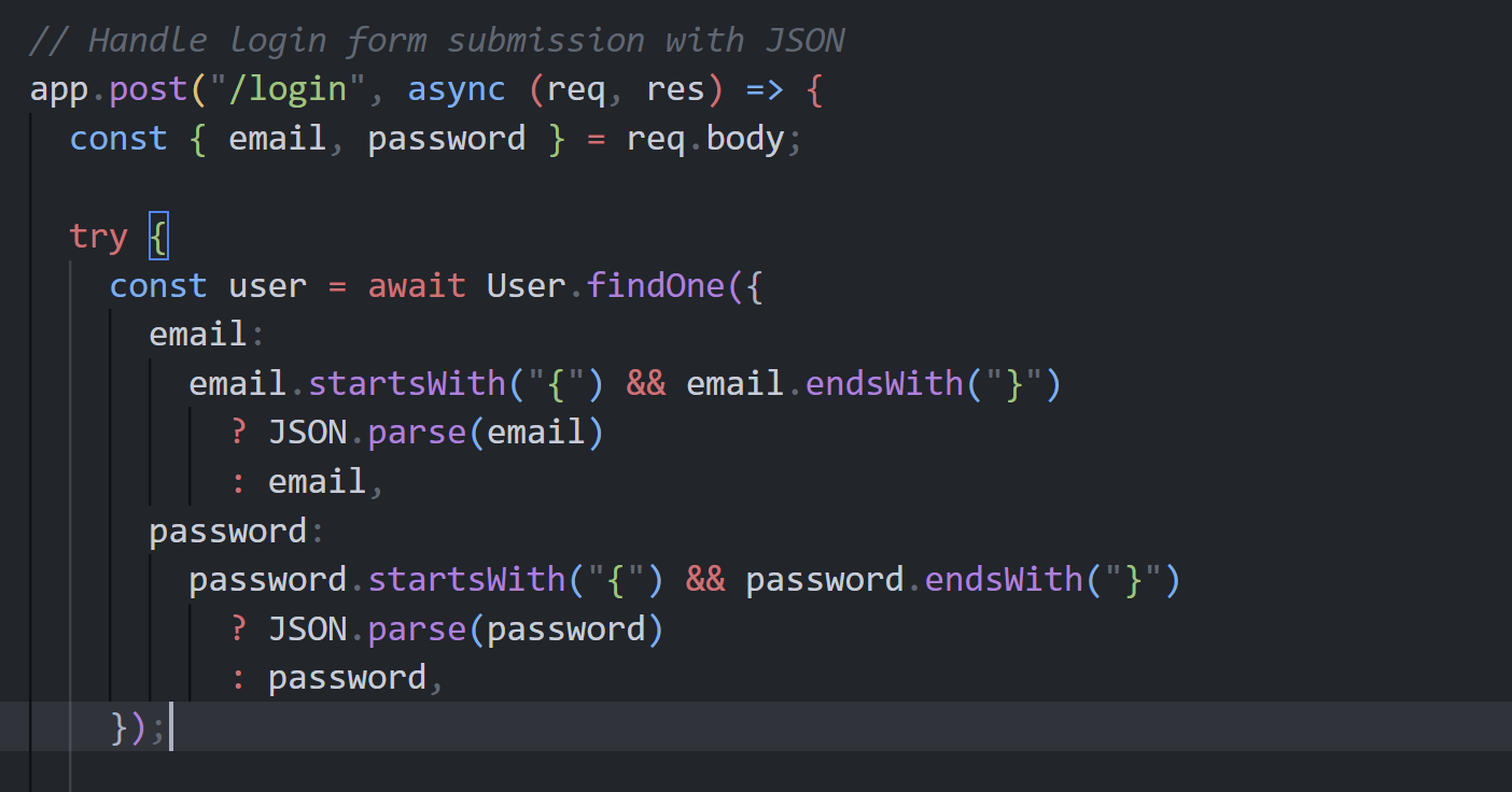 همونطور که از این تیکه از کد پیداست ظاهرا اینجا میاد و email , password رو میگیره بعدش چک میکنه اگر این دو تا متغییر استرینگی بودن که با { شروع و با } تموم شده بودن یک بار دیگه این متغییر رو با JSON پارس میکنه. کد همینجا برای ما مشکوک میشه چون ما بتونیم با استفاده از یه سری فیچر که خود mongoose ارائه میده استفاده کنیم و هر چیزی که هست (که شامل ادمین هم میشه) رو پیدا کنیم و دیتاهاش رو نمایش بدیم.